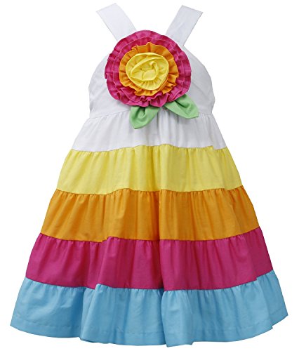 Beautiful toddler girl fuchsia/multi colorblock tier dress with large rosette applique. Machine wash. Imported (Sri Lanka). Dress of 100% cotton; Exclusive of trim/decoration. Matching/Coordinating sister styles available in sizes 3M-6X, reference style BNJ-22144M. Needed size not available/sold-out? Find similar styles, search for: bnj-ipp-girls-dressFeature