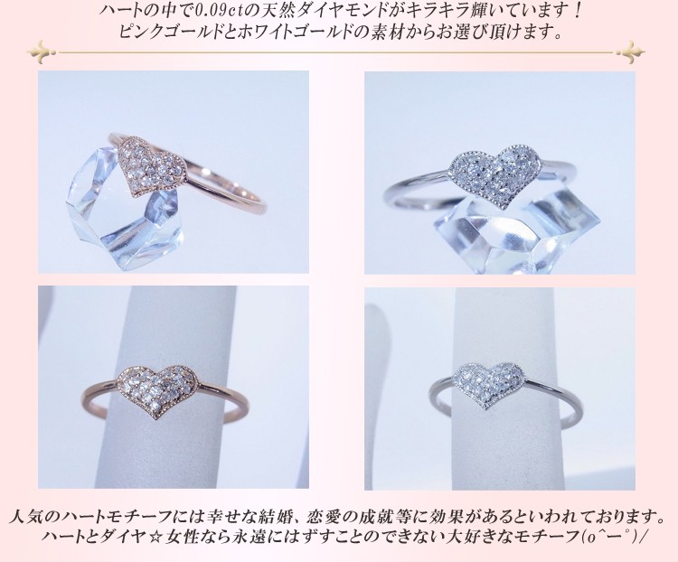 商品説明 ハートの中で0.09ctの天然ダイヤモンドがキラキラ輝いています。ピンクゴールドとホワイトゴールドの素材からお選び頂けます。