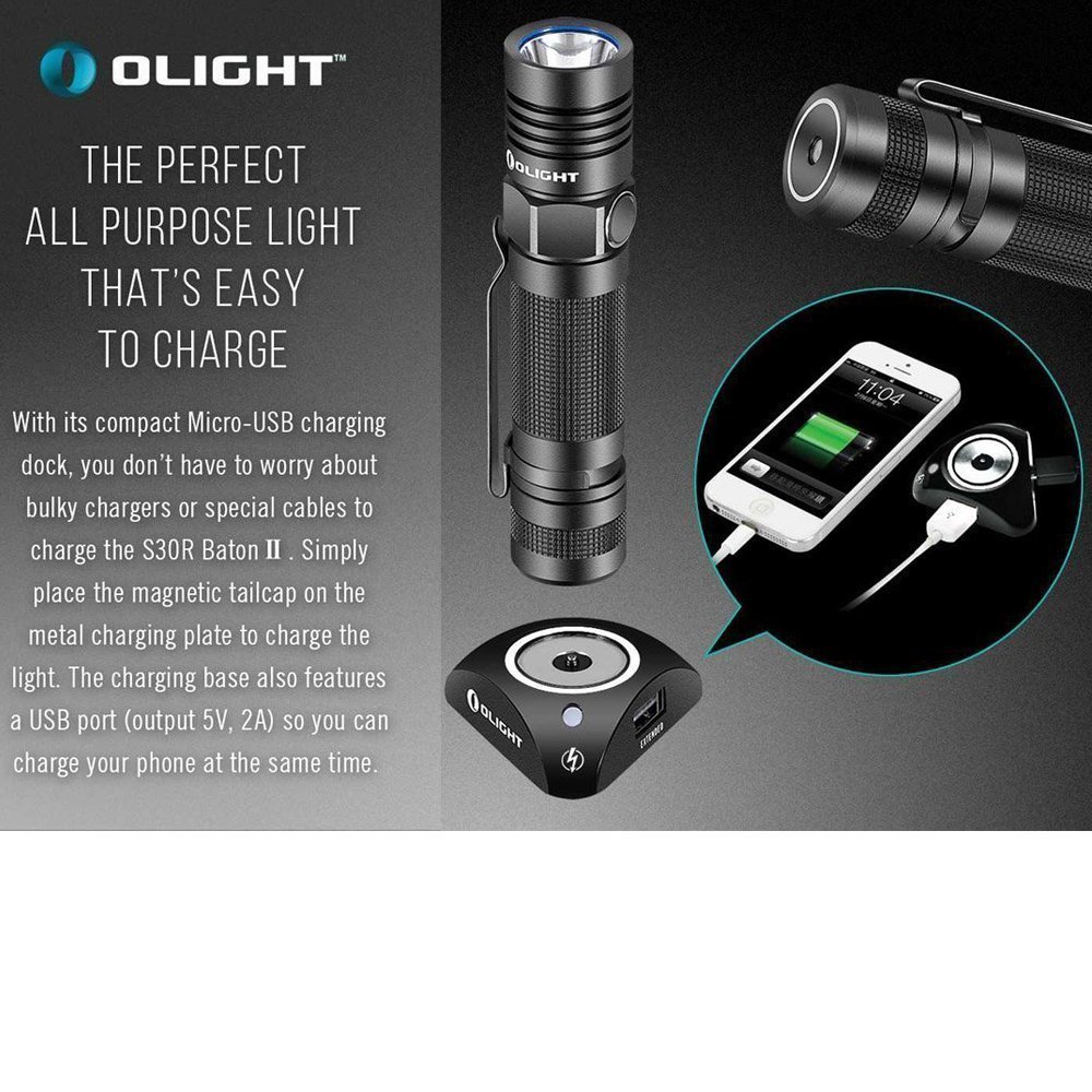 OLIGHT S30R BATON 2 is a rechargeable compact light that can be recharged with the included desktop stand.