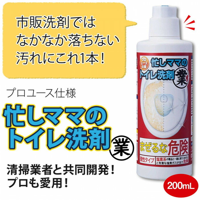 | 毎日忙しいママ必見!トイレの黄ばみ(尿石)、黒ずみは擦ってもなかなか落ちず、時間がかかっていませんか?市販の洗剤では落ちにくい頑固な汚れも、『プロユース仕様 忙しママのトイレ洗剤 業』ならプロが使う本格派だから即効性抜群。臭いも無臭ですぐ落とせるからお掃除が楽に。生分解度99%で環境にも優しい。 |