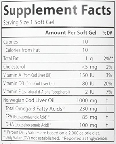 Each Cod Liver Oil soft gel contains 1,000 mg of Cod Liver Oil, providing the important omega-3s EPA and DHA which support heart, brain, vision, and joint health. This special formulation is also low in vitamin A and contains 80 IU of vitamin D3. To ensure maximum freshness, we closely manage our cod oil from sea to store. We source the highest quality, deep, cold water fish off the coast of Norway using traditional, sustainable methods. The same day they're caught, the fish arrive to a highly-regulated Norwegian facility for processing and purification. The fresh Cod Liver Oil is put into soft gels, while the rest of the fish is used for human and animal consumption, so no part of the fish is wasted.Feature