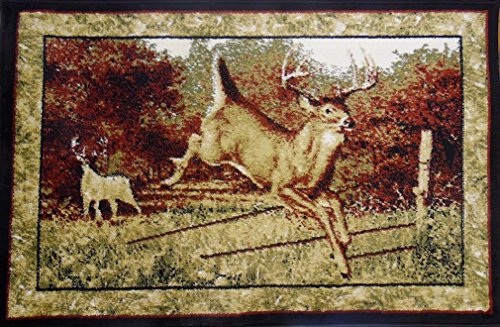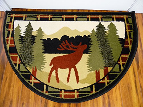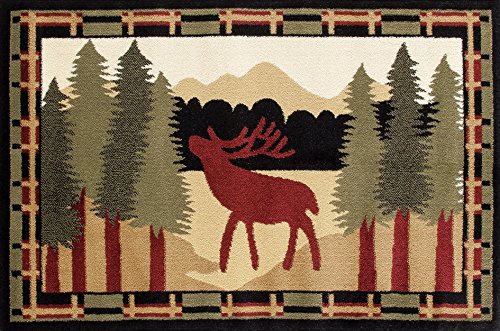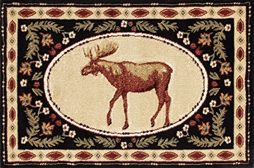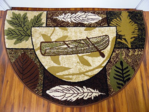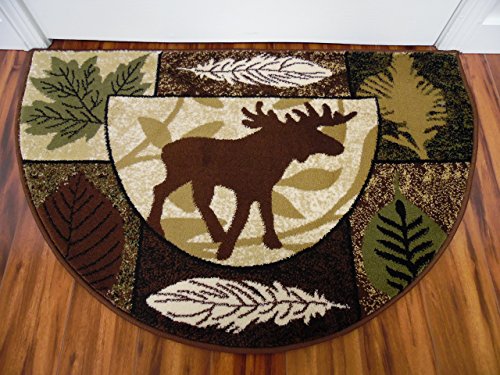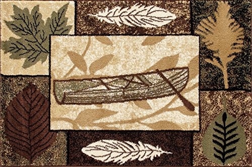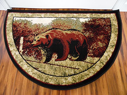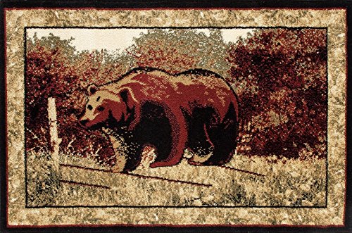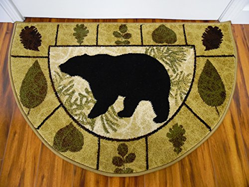 Simplified leaf prints and bear silhouette in shades of beige, light green, brown and black give a rustic block print look to this hearth rug.