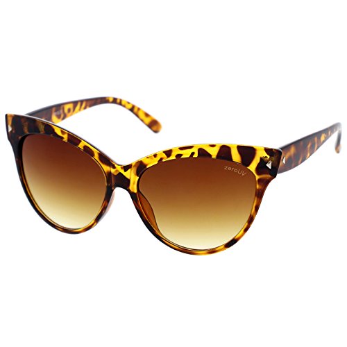 Large elegant cat eye frame that feature round curves, exaggerated pointed corners and small metal rivets on the temple. Made with an acetate based frame, metal hinges and polycarbonate UV protected lenses.