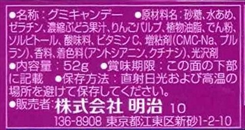 원재료:설탕,물엿,젤라틴,농축 그레이프 과즙,식물성 기름지,나오지 않겠 분,솔《비토루》,신맛료,비타민C,증점제(CMC-Na,Pull 런)고, 향료,겔화 제(백 친:사과 유래)고, 착색료(앤《도시아닌》,치자나무)고, 광택 제