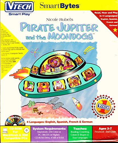 -. Binding : Toy -. EAN : 0050803825539 -. Feature : Teaches Reading, Counting, Colors and Shapes in Four Languages / English, Spanish, French & German / For Macintosh and PC -. IsAdultProduct : 0 -. Label : Vtech - Smart Bytes -. Manufacturer : Vtech - Smart Bytes -. PackageQuantity : 1 -. ProductGroup : Toy -. ProductTypeName : TOYS_AND_GAMES -. Publisher : Vtech - Smart Bytes -. Studio : Vtech - Smart Bytes -. Title : Nicole Rubel's Pirate Jupiter and the Moondogs (Old Version) - Vtech Smart Play- For Macintosh and PC -. UPC : 050803825539