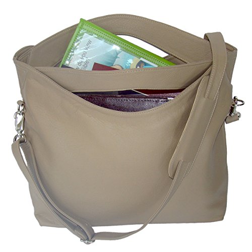 -. Feature : Lovely oversized inner compartment / Two internal zip pockets / Large divider with a special slot for magazines / Twin grab handles / Ultra light synthetic leather