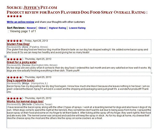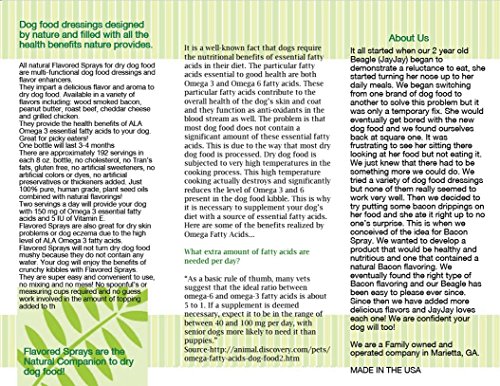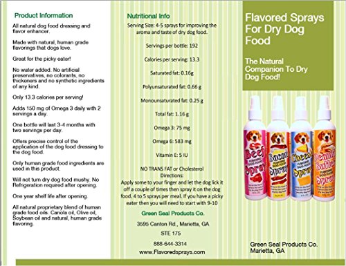 -. Feature : All Natural, no artificial preservatives, dyes, colorants, thickeners or artificial ingredients / Contributes 150 mg of ALA Omega 3 to your dog's daily diet. 150 mg of Omega 3 will make a difference in the quality of your dog's skin and coat. / A proprietary blend of human grade food oils, Olive oil, Canola oil & Soybean oil / Precise control over the application of the dog food topper to the dog food. No mixing of powders and water, No spoonfuls or scoops, just aim and spray. Will not turn dry dog food mushy, low calorie only 13.3 cal per serving, does not need to be refrigerated / Just one 8 ounce bottle will last 3-4 months. Great for the picky eater, use with all types of dogs big and small, puppies too!