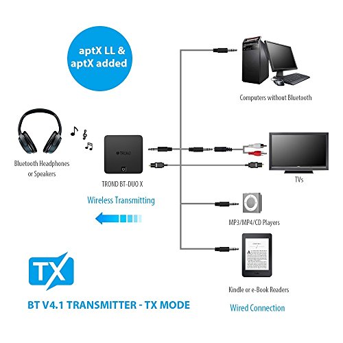 TROND TV Bluetooth Transmitter Receiver Optical, 3.5mm Wireless Audio Adapter (Latest V4.1, AptX Low Latency for both TX and RX, Pair with 2 Devices Simultaneously), for TV / Home Stereo System
