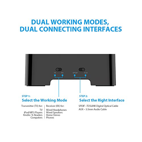 2-in-1 BLUETOOTH TRANSMITTER & RECEIVER. Powered by the premium CSR8670 chipset, TROND BT-DUO X could be switched between transmitter (TX) and receiver (RX) modes. As a Bluetooth transmitter, it enables you to transmit the audio from your TV or iPod wirelessly to Bluetooth headphones or speakers. As a Bluetooth receiver, it allows you to play the music from your phone or tablet to wired home stereo system