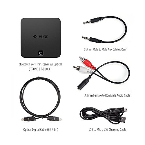 WHAT YOU GET: TROND BT-DUO X Bluetooth V4.1 Transceiver, USB to micro USB charging cable (80cm), TOSLINK audio cable (1m), 3.5mm male to 3.5mm male audio cable (50cm), 3.5mm female to RCA male audio cable (20cm), Welcome Guide, 18-MONTH TROND warranty & 30-DAY money back guarantee