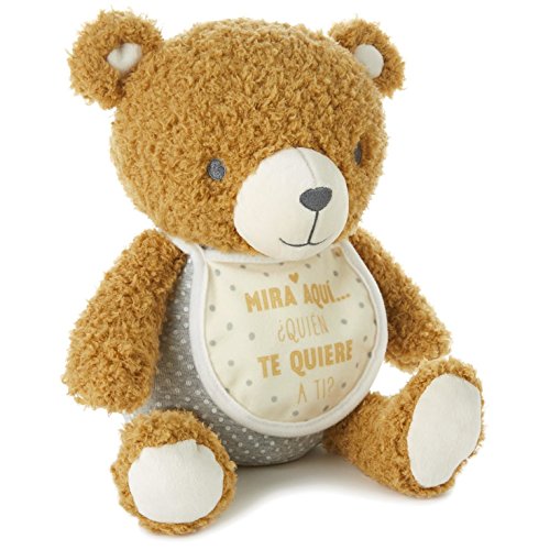 -. Feature : Your little one will love to play peek-a-boo with this snly bear stuffed animal. Soft and sweet, he wears a bib that features a Spanish message. Flip up the bib to reveal a personal photo. Clear vinyl pocket is sewn onto the bear's body for photo insertion. / On bib: em>Mira Aqui...¿Quién the Quiere a Ti?/em> / English translation: em>Peekaboo, look who loves you!/em> / Plush fabric.