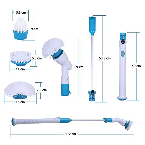 -. Feature : Strong work:Over 300 RPM of high-torque scrubbing power,Quickly blasts through soap scum, hard water and lime. / Scrubber And Cleaner:The Spin Scrubber can be used to work through soap scum, mildew, grime, Flexible bristles gets into cracks and crevices with effectiveness!(Give Gap Cleaning Brushes). / Multi-Function Spin Scrubber Head:Turbo Scrub, extension wand, dome brush, cone brush, flat brush and AC Adapter to help get into corners better than a long handled scrub brush. / Perfect For Multiple Cleaning Tasks:Automatic cleaning scrubber can be used indoor and outdoor,it's great for curves,tile, sink bowls,toilets,bathtub,door slots,shower windows,it also cleans car tires and mags well. / Cordless Spin Scrubber:Electric Spin Scrubber is powerful enough to clean the stains with reasonable effort,scrubs away dirt without abrasive chemicals,no worry about the cord will disturb you cleaning any area.