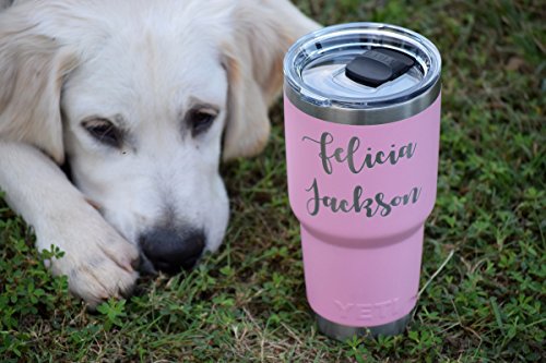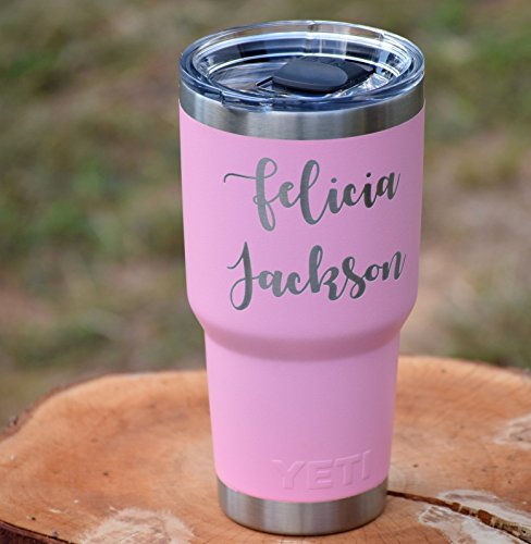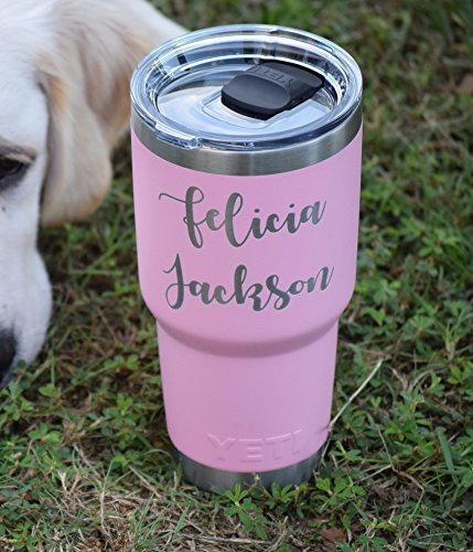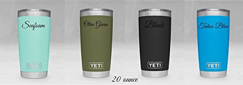 Product Description Personalized Yeti Rambler tumbler, Stainless Steel 18/8, available in 20 oz or 30 oz. This popular cup makes for the perfect birthday, graduation, wedding, promotional or any occasion gift. It features personalized engraving of your choice, YES these are laser engraved NOT STICKERS so it will last forever! Additional designs are always welcome, we are happy to work with you to create the tumbler you want! 1000s of additional fonts are also available. Little bit about Yeti Rambler's: beverages will stay ice cold or steaming hot. Double-wall insulated tumblers with an 18/8 stainless steel body, which means your drink still keeps its temperature no matter how much of a beating this cup takes. Tumblers are BPA-free, have a No Sweat Design to make sure your hands stay dry. Fit in most all cup holders. We promise you will not be disappointed, this mug delivers! No matter which Tumbler you choose, Ramblers are dishwasher safe, BPA-free, and ready for just about anything. Tumblers are available in Pink, Tahoe Blue, Seafoam, Olive Green, Black, and Stainless Steel. 0