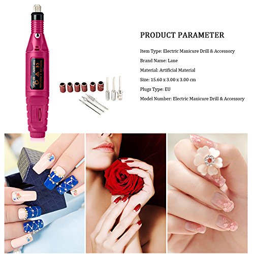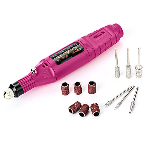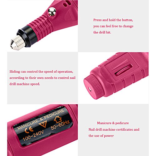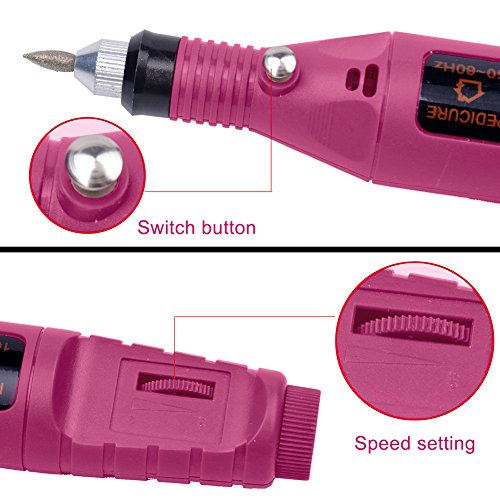Features: Fast/Slow, low noise and slight vibration for smooth and long-time operation.Manicure set is field with 6 opional standard metal bits heads and 6 sanding bands. Easy to change and control.Suitable for pedicure and manicure Quiet and Smooth.Portable Easy to carry out Quiet and smooth,accepts all rotary tool accessories;Double Bearings Design and Double Insulated. Multifunction manicure set used to carving, engraving, routing, grinding, sharpening, sanding, polishing, drilling and so on. Tips about how the entire drill was set up.It is as simple as 1.2.3. *1.) Unscrew the black piece directly underneath where you would put the drill bits in *2.) Push the silver button on the side *3.) Unscrew the silver piece that the drill bits directly go in *4.) You'll notice everything is LOOSE. Without twisting the silver part completely off, put in which ever drill bit of your choice and push it down COMPLETELY! *5.) IMPORTANT: Make sure you screw the silver part which you inserted the drill bit in tightly Enjoy your drill. It really does work. I used it for the first time on a practice acrylic finger and it got the job done!