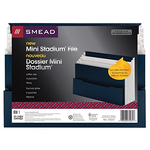 -. Binding : Office Product -. Brand : Smead -. EAN : 0739197620202 -. Feature : Organize daily correspondence to insure prompt and timely follow-up / Clutter is contained to a single Receptacle / Stores everything from files to envelopes to sticky notes / Three large Pockets are tiered and fixed so papers don't fall to the bottom of the file / designed for letter size folders -. Label : Smead Inc. -. Manufacturer : Smead Inc. -. Model : 70231 -. MPN : 70231 -. NumberOfItems : 1 -. PackageQuantity : 1 -. PartNumber : 70231 -. ProductGroup : Office Product -. ProductTypeName : OFFICE_PRODUCTS -. PublicationDate : 2015-12-01 -. Publisher : Smead Inc. -. Studio : Smead Inc. -. Title : Smead Mini Stadium File, 3 Pockets, Small Front Pocket, Letter Size, Navy (70231) -. UPC : 086486702317