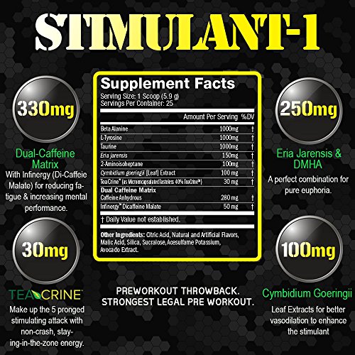 Looking for the pre-workouts of the past? Something that will make your skin crawl? Well, you found it with Stimulant-1. Loaded with a dual caffeine matrix that will have you shattering weight training plateaus.