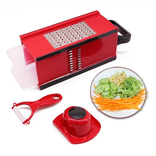 Most Versatile Kitchen Tool:The mandolin slicer set contains a main frame body with 4 blades on it(1/13"slicer, 1/5" Julienne slicer, 1/8" Julienne slicer, Grater) ,a food container to hold your food and keep it clean, a safe guard to protect your hands from getting hurt and a ceramics peeler. A set with high value of money. Best for making quick and healthy salads