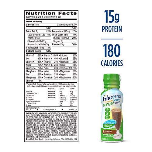 Glucerna Hunger Smart shakes help manage hunger with 15 grams of protein, 180 calories and up to 5g of fiber** (**dietary fiber: vanilla and strawberry - 3g; chocolate - 5g, per 10 fl oz)