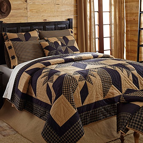 Studio : Victorian Heart Company Publisher : Victorian Heart Company Product Description The Dakota Star collection is a black and khaki story. It features a traditional 8 point star in the center, surrounded by a feathered star quilted pattern. The Ashton Willow king quilt measures 95x105". The back of the quilt is solid khaki. It has 100% cotton shell and is hand quilted with stitch in the ditch and echo quilting.105" Wide x 95" Long Priced and sold individually. Order a Dakota Star Quilt plus 3 or more Dakota Bedding accessories and receive an extra 10% off the Victorian Heart bedding items in your order. (Discount will be reflected as you check out.) Designed and manufactured by Ashton Willow for VHC Brands. 0