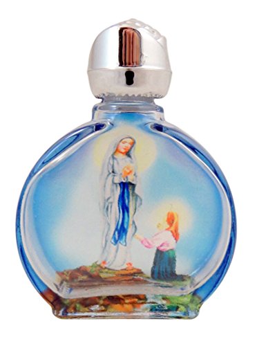 Stained Glass Our Lady of Lourdes Holy Water Bottle with Rosebud Lid, 0.5 oz