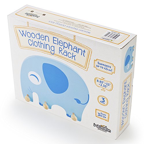 -. Binding : Kitchen -. Brand : Imagination Generation -. Color : Blue -. EAN : 0796520343399 -. Feature : There's an elephant in the room! / Keeps messy rooms clean and clothes and bags up off the floor / Holds up to 45 lbs! The rack features three durable hardwood pegs that can each hold up to 15 lbs. / No assembly required, and mounts easily with minimal hardware (not included) / Dimensions: 11" x 8.85" x 2.35" -. Label : Imagination Generation -. Manufacturer : Imagination Generation -. ProductGroup : Home -. ProductTypeName : HOME -. Publisher : Imagination Generation -. Studio : Imagination Generation -. Title : Wooden Elephant Clothing Rack by Imagination Generation -. UPC : 796520343399