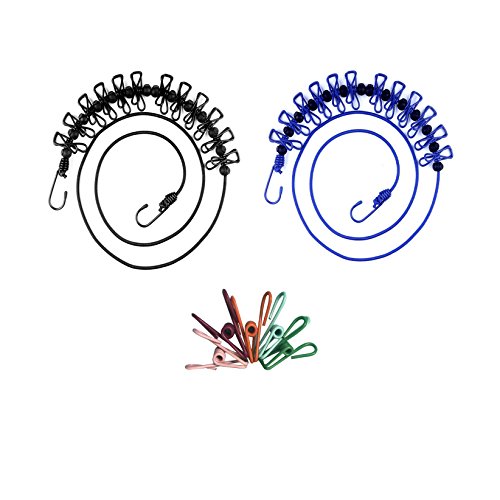 - In the past travel clotheslines failed to deal with things like sagging under weight of clothes, clips bunching together because of the sagging, etc. This laundry line has little control clips on each side of every clothes clip so that the bunching effect of sagging can be avoided. 5 free pieces of clothespins are included in this package for your favorite. The bungee cord was very stretchy, so I was able to create enough line to dry many clothes at once.