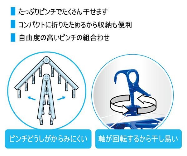 たっぷりピンチでたくさん干せます。室内干しに便利なフックと、屋外で風が吹いても安心なキャッチフック付き。さらに回転式ネックで干しやすい。 |