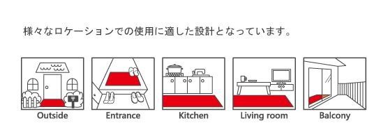 機能面においては、wash+dryというブランドが示すように、耐洗濯性と速乾性に優れており、マット裏面をPVCが含まれていないラバー(特殊合成ゴム)で加工していることで、いかなる床面にもフィットします。