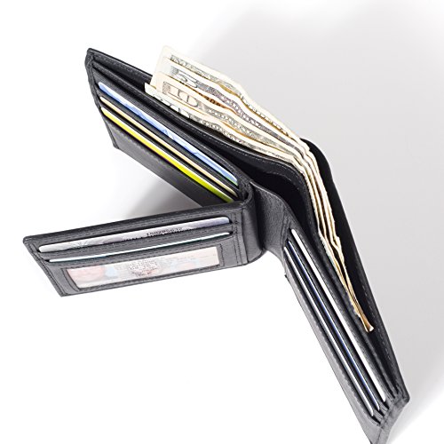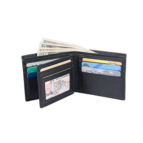 -. Feature : 10 card slots - Bi-Fold / Divided billfold / Color: Black/ 3.5 inches x 4.5 inches x 0.75 inches/ Weight: 2.7 Oz / Transparent ID slot (as pictured) / Every single pocket on every single wallet is entirely shielded individually, locking your personal information safely inside.