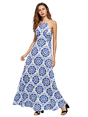 Sleeveless, halter neck, backless, zipper back, maxi dress.
