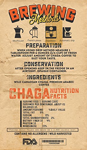 -. Feature : MADE FROM PREMIUM WILD HARVESTED CHAGA & ARABICA COFFEE / CHAGA CONTAINS 215 PHYTONUTRIENTS / INCLUDING 29 POLYSACCHARIDE OR BETA GLUCAN DERIVATIVES / CHAGA RATES THE HIGHEST ON THE ORAC SCALE OF ANTIOXIDANTS / A NUTRITIOUS BLEND WITH A REFINED FLAVOR & DELICIOUS FRAGRANT AROMA