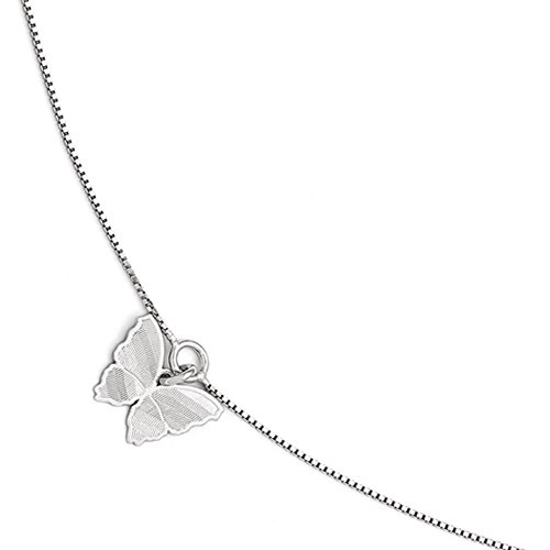A textured 15mm (9/16 inches) butterfly dangles seductively from the center of a gleaming 1mm box chain fashioned from polished sterling silver. This ankle bracelet secures to your leg with a fancy lobster clasp and is adjustable in length from 9 to 10 inches. Made in ItalyFeature