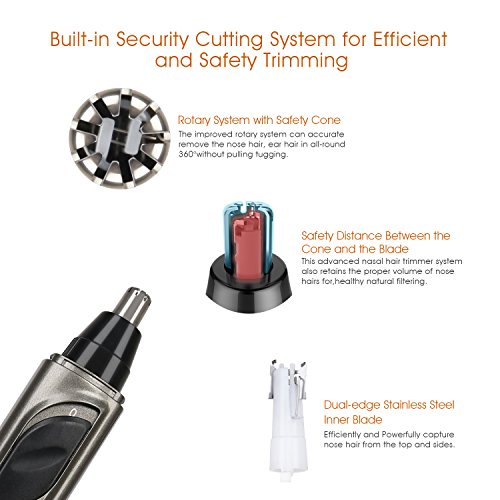 - NOISE REDUCTION DESIGN & WET/DRY DUAL USE : With noise reduction design, the sound of shaving is below 50 DB, you can use the nose trimmer confidently while your families are sleeping. IPX 7 Technology allows you to use the this 3 in 1 nose ear hair trimmer in or out of the shower and makes for an easy rinse off in seconds.