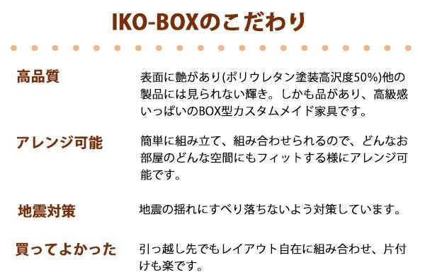 お部屋をあなただけのショーウィンドーに!IKO-BOX(イコウ・ボックス)は「室内に調和する最適な家具」をコンセプトに造られたBOX型ユニット家具です。レイアウト自在で、縦横自由に組み合わせることにより、書棚、壁面収納、TVボード、パソコンデスク、カウンターBOX、ディスプレー、収納付きパーテーション、レコードBOX、DVD&CDラック等、レイアウト次第でいろいろな収納スペースを造ることが出来ます。 |