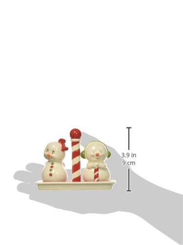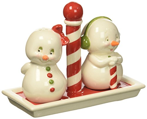 - Showcases two adorable snowman salt & pepper shakers resting on a festive tray