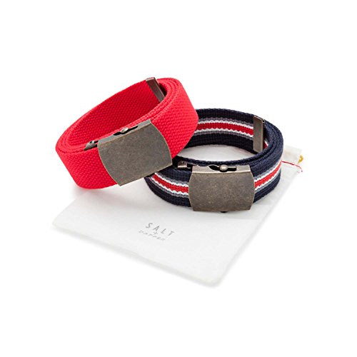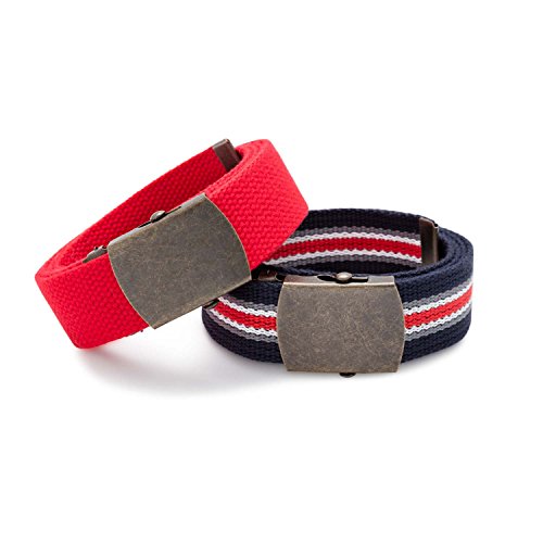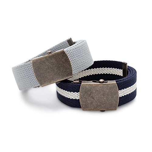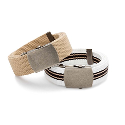 Set of 2 belts. Lose the heavy leather this summer and pick up a set of light and fun cotton web belts! These belts are constructed from a sturdy woven cotton and are adjustable to be fitted to your customization. Wear any of these with your khakis, shorts, jeans or any casual wear. Measures 1.25" wide and 50" length that can be sized down to your specifications. These 2 belt sets are paired up for a great combo of color, pattern, and tone. For every day summer wear or a casual stroll on the beach, be sure to pick up this white base belt with antique bronze stripes and coordinating buckle accompanied by a solid tan belt too! Bonus: For some extra swag, leave the belt extra long and tuck the end in a loop! Consult our style card insert for more info. Belts come packaged in a nifty drawstring pouch instantly ready for a gift or stowaway! Sizing and style instructions included.Feature