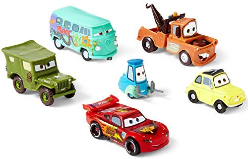 -. Feature : set includes Luigi, Guido, Lightning McQueen, Mater, Sarge and Fillmore / 10th Anniversary set / molded plastic (wheels do not move) / measure between 1.75 and 3.5"