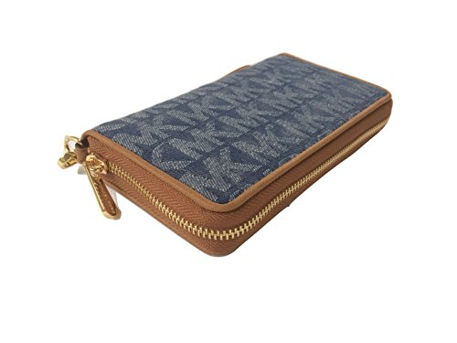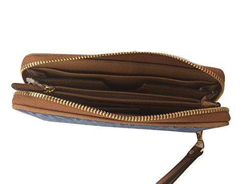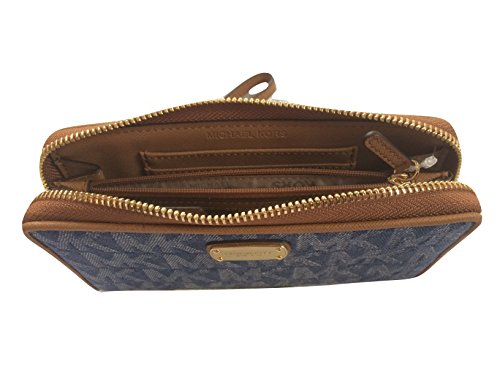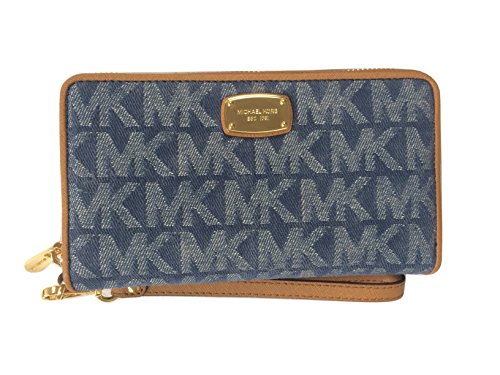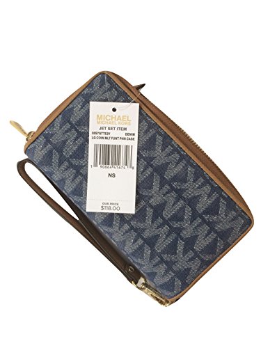 Binding : Apparel Product Description Michael Kors Jet Set Large Coin Multifunction Phone Case Wristlet is crafted in monogram print jacquard with polished golden tone hardware. This zip around style wallet case is accented with Michael Kors nameplate on the front. The interior features (3) card slots, a full length bill compartment, and a center zippered compartment. There is also a space that will hold most smaller models of iPhone, Samsung Galaxy and Blackberry phones. It features a removable leather wristlet strap which enables you to carry it as a clutch as well. It measures approximately 7.25 inches (L) x 4 inches (H) x 1 inch (W). 0