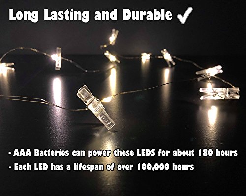 - ✔LONG LASTING, DURABLE, HIGH QUALITY✔ - Batteries won't have to be replaced too often, our lights can stay powered by batteries for about 180 hours before needing battery replacement! PLUS the lifespan of each LED is over 100,000 hours. If that isn't enough, Our led photo clip string lights can hold up to 8 POUNDS! Others can only hold up to 4-6 pounds.