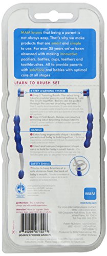 MAM Learn to Brush set is perfect for parents and children, MAM Oral Care products right from the start. Developed with dentists, the smart MAM Oral Care products ensure that babies get used to regular oral hygiene step by step. Trendy colors and shapes arouse baby's interest and encourage him to clean his teeth. With MAM toothbrushes, dosing is simple: The toothpaste goes right on the pink bristles. Just a touch is enough for babies and a pea-sized amount is ideal for toddlers. Set comes with 2 brushes: one with a long handle for baby and parent to brush together and one with a short and compact handle for children that have learned independent brushing. Boy colors. 6 + months.Feature