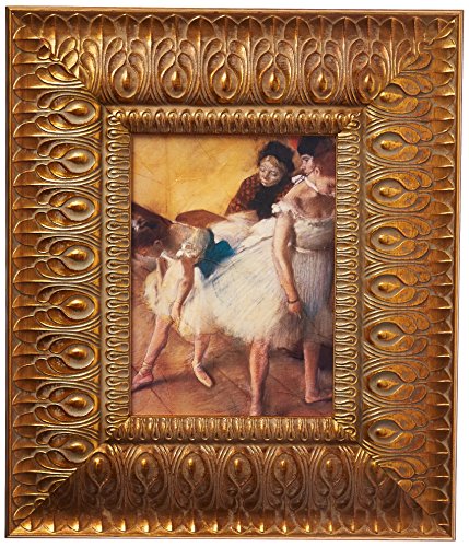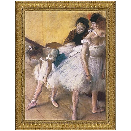 Limbering up before rehearsal, ballerinas stretch at the bar in this expertly rendered work that retains the edge of realism. Though grouped with the Impressionists because he also favored dazzling colors and the effects of light, Degas never painted en plein air, but favored a technique that demanded the planning and execution modeled by the old masters. The authentic stretched canvas replica painting captures the original work's texture, depth of color, and even its bold brushstrokes, which are applied by hand exclusively for Design Toscano. The imported, delicately carved hardwood frame boasts a delicate leaf motif with fine feathered detailing finished in antique gold tones. Small: 14and 1/2"Wx17"H.Feature