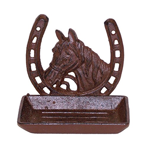 -. Feature : A Brand New Cast Iron Western Rustic looking soap dish with a horse head and horseshoe / Rustic Cast Iron Soap Dish is well made and can be used indoors or outdoors / Great details and beautiful rustic finish make this item a perfect addition to a bathroom or powder room / Mount this horseshoe soap dish easily on your wall through the two holes in the horseshoe / Western Decor Horseshoe soap dish ships brand new in manufacturers packaging