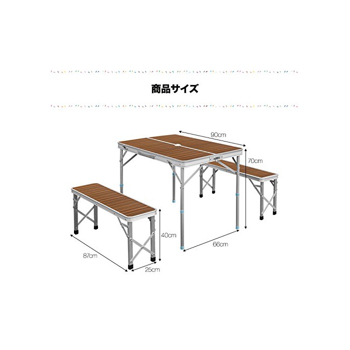 사이즈 테이블 : (약)W90cm×D66cm×H70cm / 40cm 벤치 : (약)W87cm×D25cm×H40cm 접이식 시 : (약)W90cm×D33cm×H10cm 파라솔용 홀 직경 : (약)2.5cm