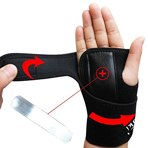 -. Feature : PU,Steel Plate,62% SBR and 38% OK cloth. / Relieve pain and swelling from Carpal Tunnel,Sprains and Strains,Arthritis,Tendonitis etc while maintaining full range of movements of thumb and fingers. / Removable curved metal splint immobilizes wrist in natural position.Simply remove it with more hands flexible when cooking,typing and doing sports. / Adjustable two straps with velcros is easy to put on for most hands size. And you can adjust it with your required amount of hand support for tight or loose. / Breathable soft OK fabric keeps hands clean and dry with sweat-absorbing.Quality PU leather palm provides strong and comfort support in hand grip.