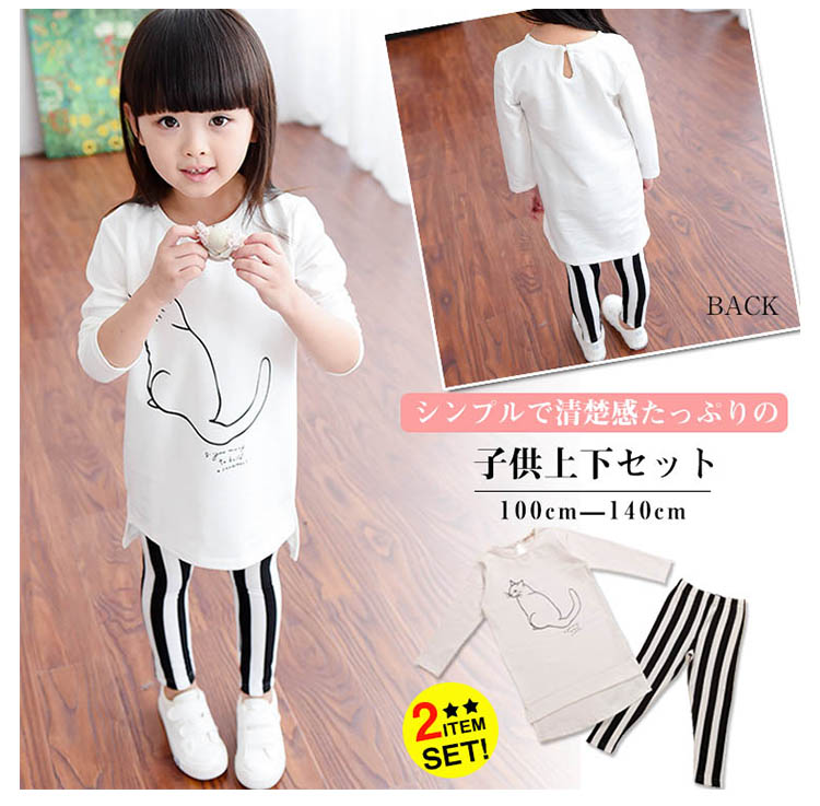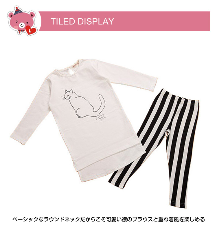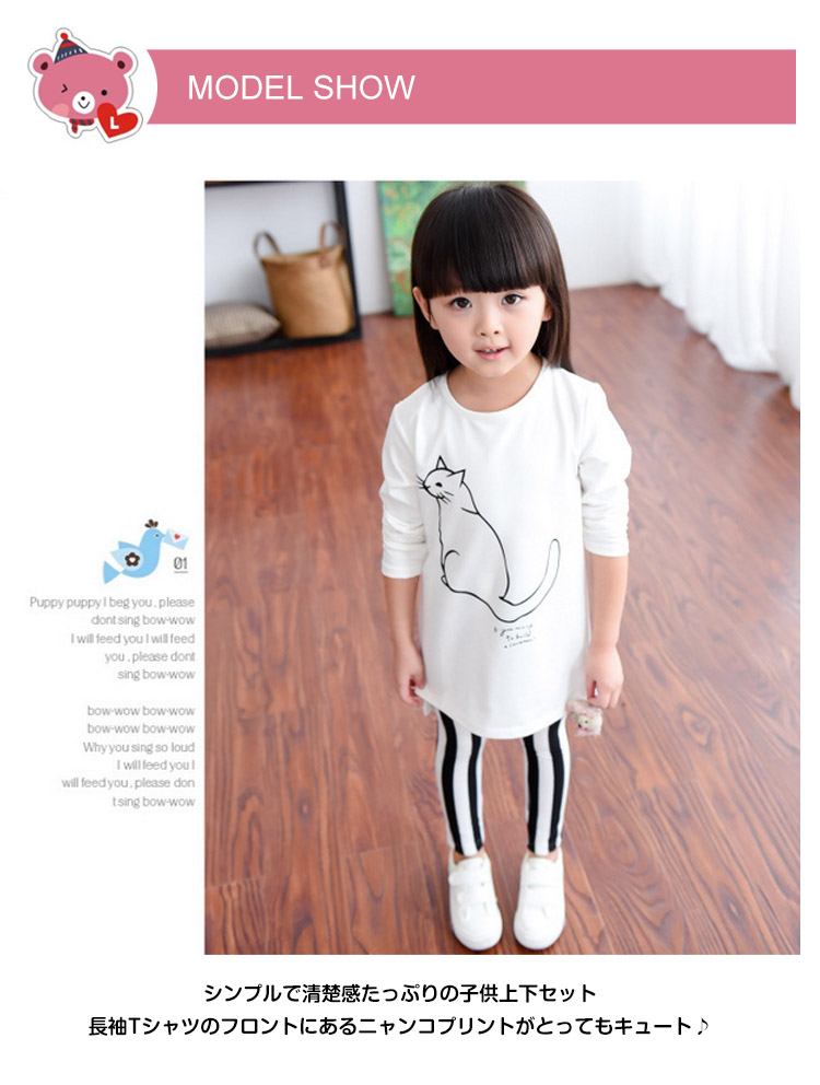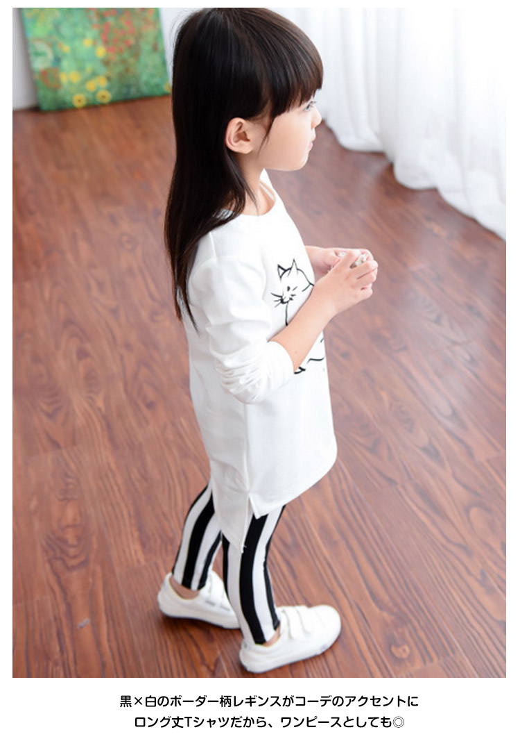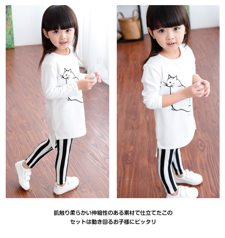 | シンプルで清楚感たっぷりの子供上下セット長袖Tシャツのフロントにあるニャンコプリントがとってもキュート♪黒×白のボーダー柄レギンスがコーデのアクセントにロング丈Tシャツだから、ワンピースとしても◎肌触り柔らかい伸縮性のある素材で仕立てたこのセットは動き回るお子様にピッタリ | |