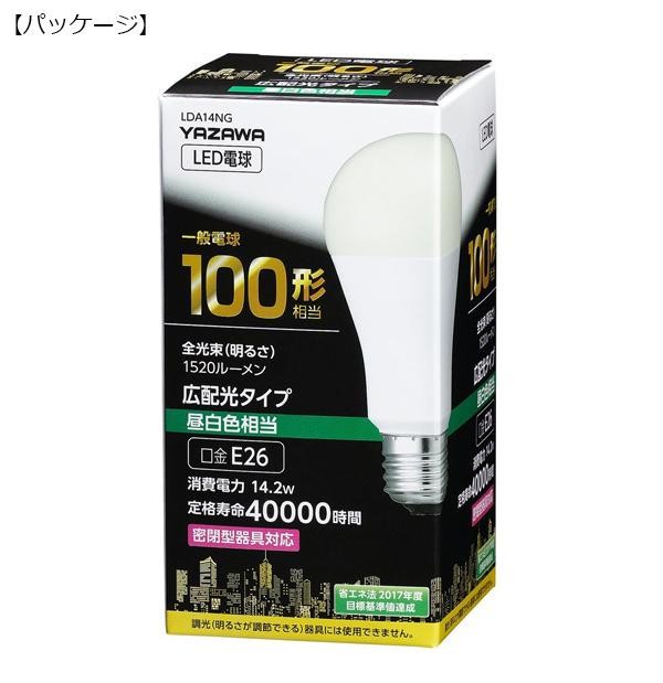 | 仕様 | 口金:E26 定格電圧:100V 定格消費電力:14.2W 定格入力電流:0.24A 光源色:昼白色 全光束:1520lm 色温度:5000K 調光対応:不可 設計寿命:40000h 密閉型器具:対応 取扱説明書(パッケージ記載) |