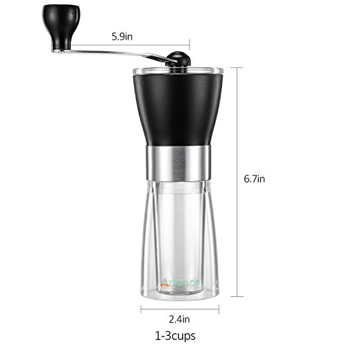★ Sleek Design - Conical look ,visually pleasing,with a nice aesthetic touch.Small Dimension takes less space.Transparent and double-layered storage bin does a more controlled grinding and maintains the original freshness and flavor of ground coffee