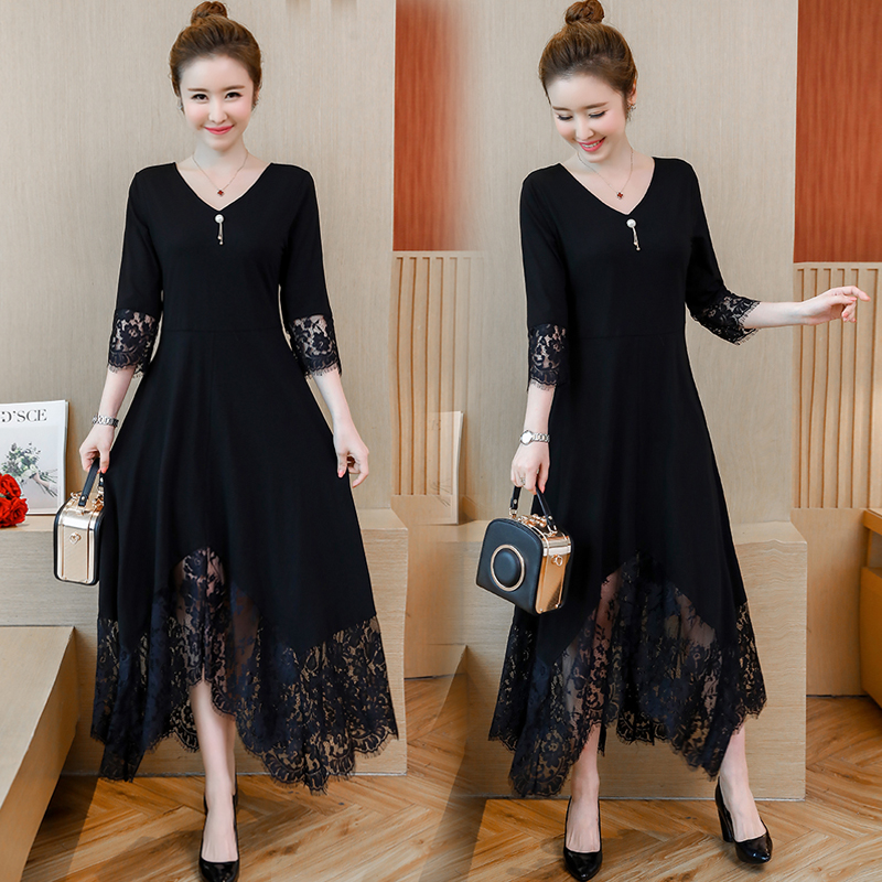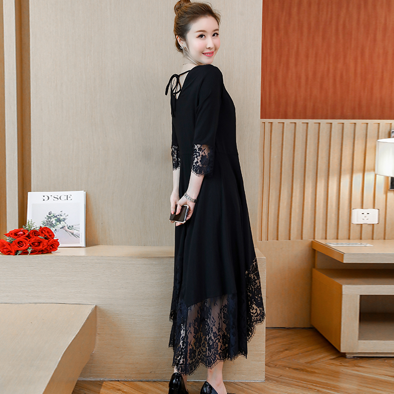 袖とスカート裾のレースが繊細で華やかなロングドレスです