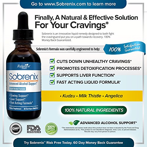 -. Feature : STRLING TO CONTROL YOUR ALCOHOL CONSUMPTION? Sobrenix is designed to reduce alcohol cravings and help you detoxify your body so you can successfully manage alcohol consumption. Even better, taken before drinking, Sobrenix's ingredients help you stop before you've had too much. / DETOXIFY YOUR BODY & GET RID OF HANGOVERS with this all-natural formula that combines herbs and nutrients that support liver health, curb cravings, and help you wake up without a nasty hangover. Sobrenix kick-starts the detoxification process with essential herbs like Milk Thistle and Chanca Piedra. Additionally, the formula contains the critical B-Vitamins that alcohol washes away so you can wake up happy and healthy again! / LIQUID FORMULA FOR DOUBLE ABSORPTION! Studies have shown that the body uses up to 98% of a liquid extract compared to only about 39-53% of a tablet or capsule. Furthermore, 87% of liquid formulas are absorbed in the first 20-30 seconds. Don't waste money on lesser alcohol support supplements! / ALL NATURAL AND SATISFACTION GUARANTEED: Ingredients sourced from nutrient-dense plants and herbs, combined with essential minerals and amino acids, and formulated in the United States. 100% no-questions-asked money back guarantee. Send the bottle back at any time to receive a full refund.