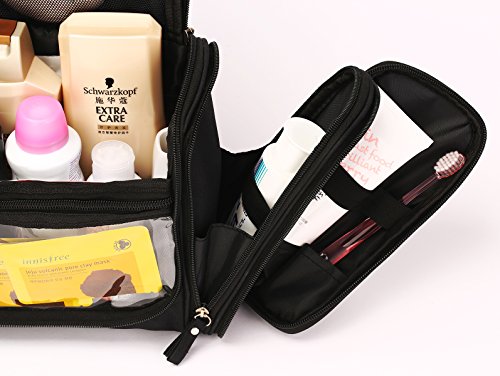 - Feature : Made of durable polyester that is water-resistant fabric / High Capacity:7.6L 11.3"*4.7"*8.6"(29*12*22cm) / Has plenty of pockets and compartments, there should be enough room for items such as deodorant, mouthwash, a toothbrush, toothpaste, dental floss, hairbrush, combs, band-aids, shaving cream, razors, and even your phone ect / Great way to separate all your personal items from clothes and sneakers when traveling / Waterproof, could hanging it in the bathroom with no damage,best for family trips